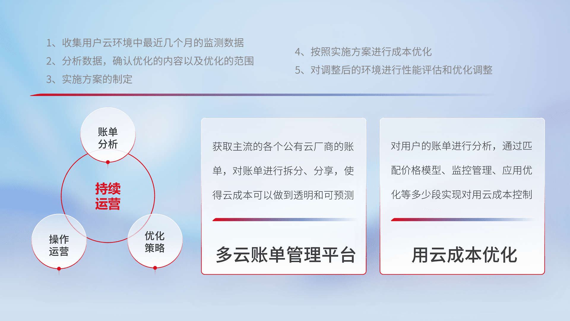 通过多云纳管,,以统一的资源数据模型把客户的云资源进行抽象和封装,,进而实现对多云资源的统一操作,,保障云资源管理的可靠性、、稳定性与可用性。。。量身定制化运维内容,,,配置、、、开发运维、、、补丁管理、、、备份、、、、监控、、认证和访问管理、、、、审计和日常巡检等,,,保障在用云过程中的可靠度,,,稳定度以及高可用率。。。。